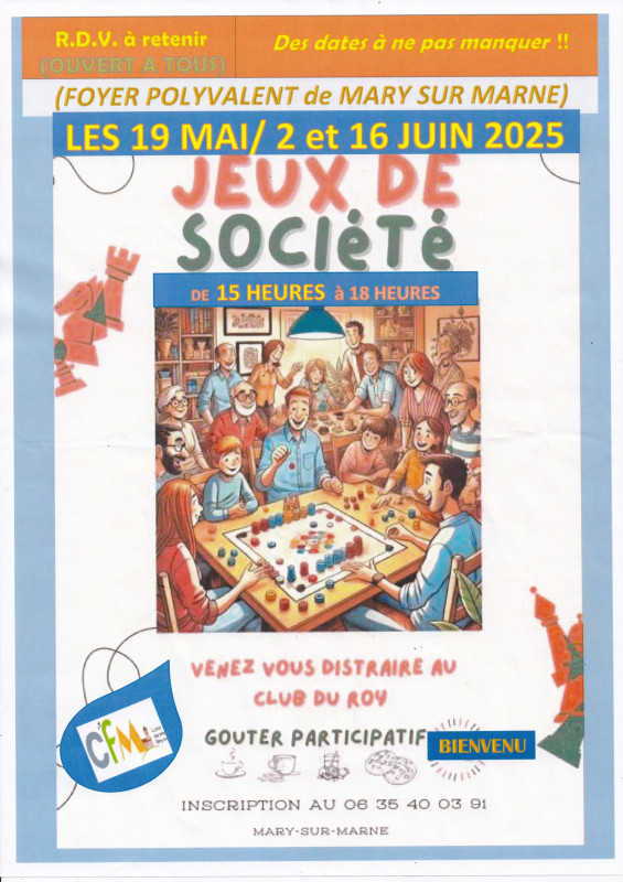 Jeux de société le lundi 16 juin 2025 Posté le 19/05/2025 - Par C.F.M Animation du village par des manifestations culturelles, de divertissements, organisation de sorties et de voyages divers.